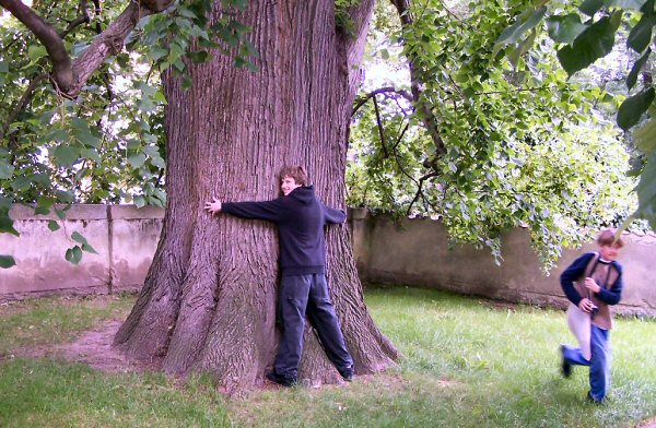 Tyler hugging an old tree